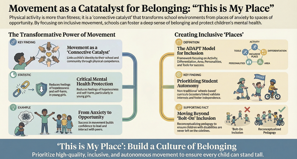 Finally, a sense of place requires autonomy. Children need to feel they have a choice in how they move. This is why I advocate for a broader curriculum that includes non-traditional activities, such as a wheels-based curriculum (scooters, skateboards, balance bikes). For many children, a scooter or a bike is their first taste of independence; bringing that into the school setting validates their interests and helps them become creative movers. By prioritising high-quality, inclusive, and autonomous movement opportunities, we do more than improve health statistics. We build a school culture where every child, regardless of gender, ability, or background, can stand tall and say, this is my place.