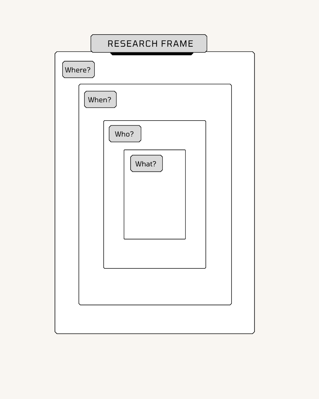 Simple infographic showing a stack of nested frames under the heading “Research Frame.” Labels progress inward from broad to specific: outer frame “Where?”, next “When?”, then “Who?”, and the innermost box “What?”.