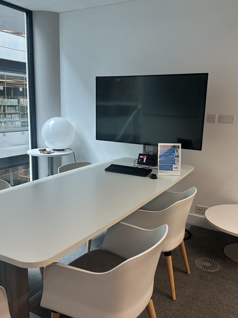 We have six bookable group study rooms which you can book, located on the first, second and third floors. Group study rooms offer a PC, large screen and whiteboard. These are great rooms to use if preparing for practising a presentation or collaborating with a group on a project.