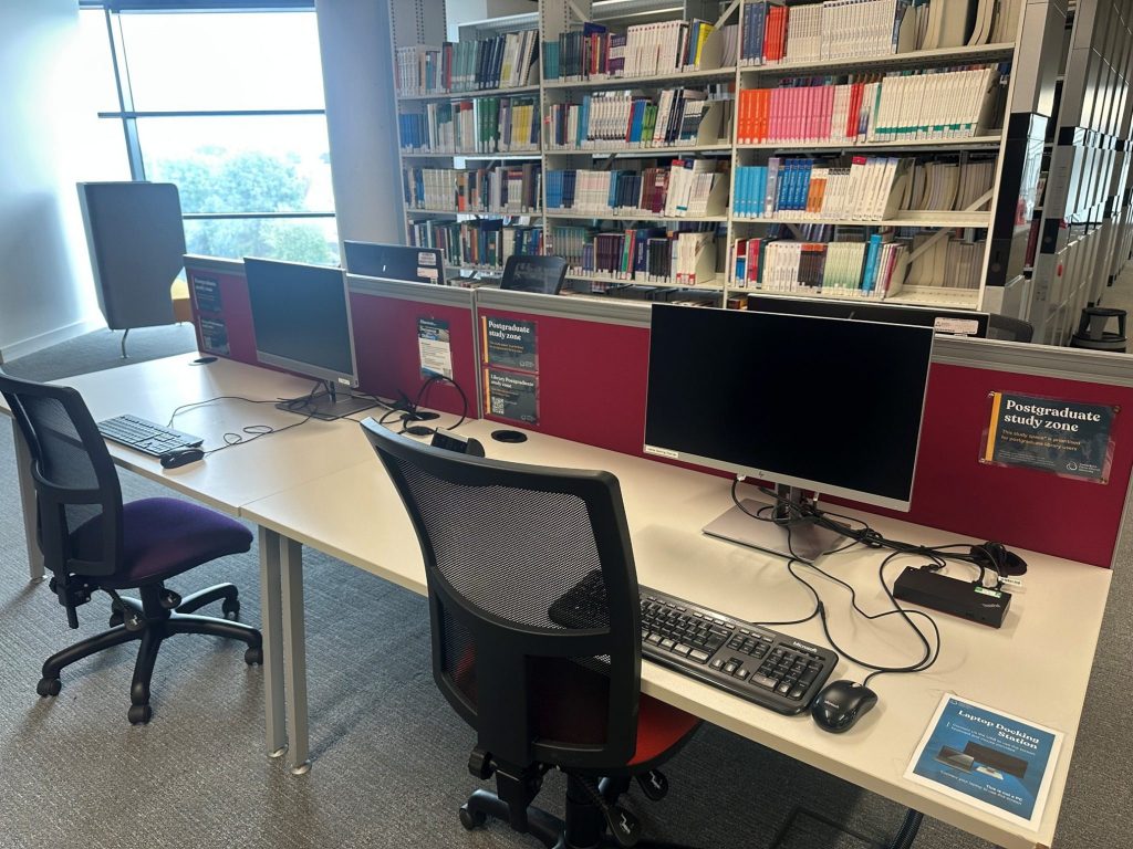 The postgraduate study space is co-located with the collaborative zone on third floor, in front of the moving shelves.