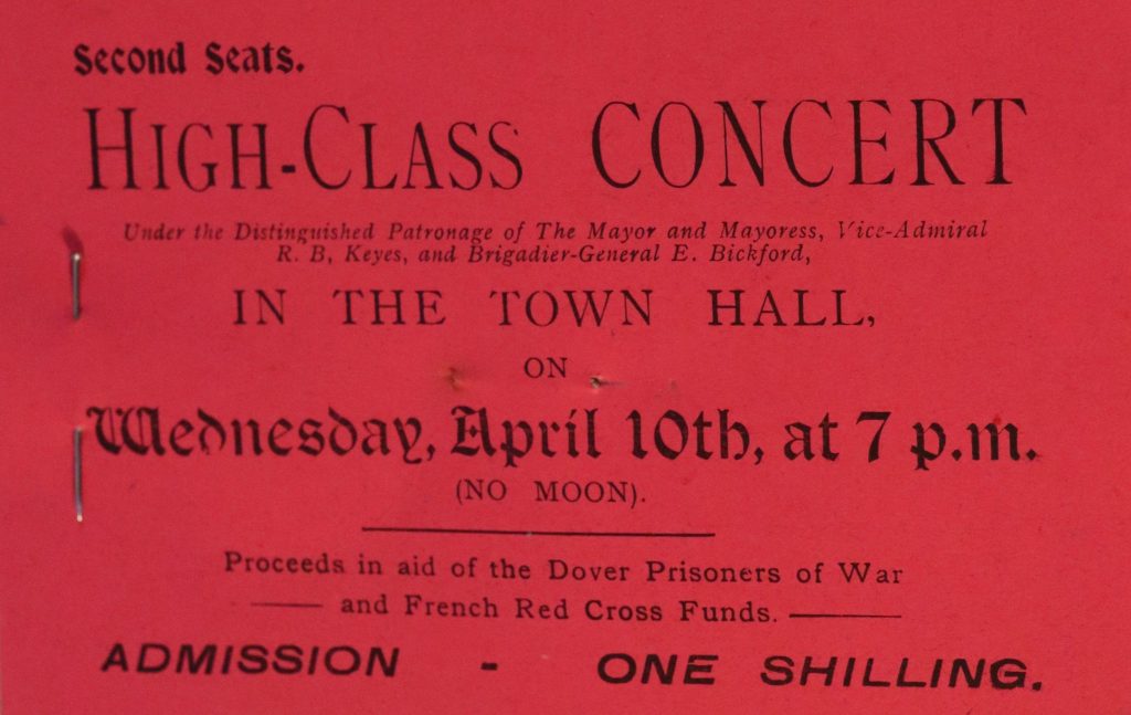 On Wednesday 10th April 1918, a high-class concert under the patronage of the Mayor and Mayoress, Edwin and Mrs Farley; Vice Admiral Keyes; and Brigadier General Bickford took place in the Town Hall to raise money for the Dover Prisoners of War and the French Red Cross Funds.