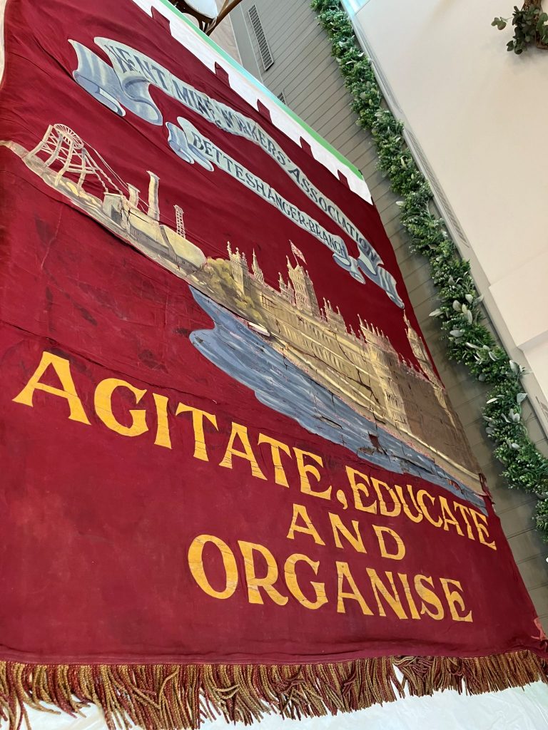 This year we had the privilege to see the original Betteshanger miners’ banner displayed. This precious piece of history accompanied the miners on marches since the 1930s. Over the years, it was trampled upon by police horses, rolled up for a time under a bed for safe keeping, archived in different museums and now is safely home in Betteshanger.