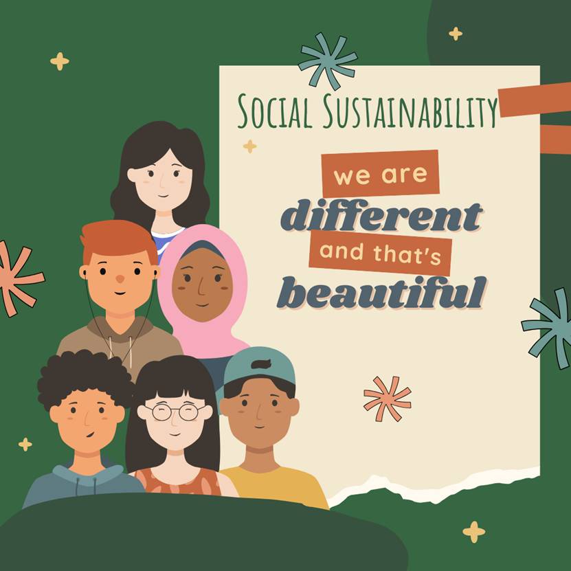 Image description: a graphic made on Canva with a group of cartoon people and the phrase “Social Sustainabiliy: we are different and that’s beautiful”.