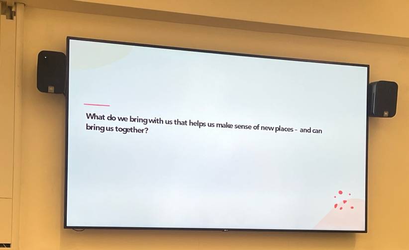 Image description: presentation screen reading: “what do we bring with us that helps us make sense of new places – and can bring us together?”